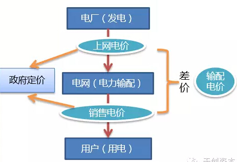 过去的售电模式如下图:电厂根据政府定的“上网电价”把电卖给电网,政府再定出不同的“销售电价”通过电网把电卖给不同用户,其中的差价叫做“输配电价”这也是电网的收入。